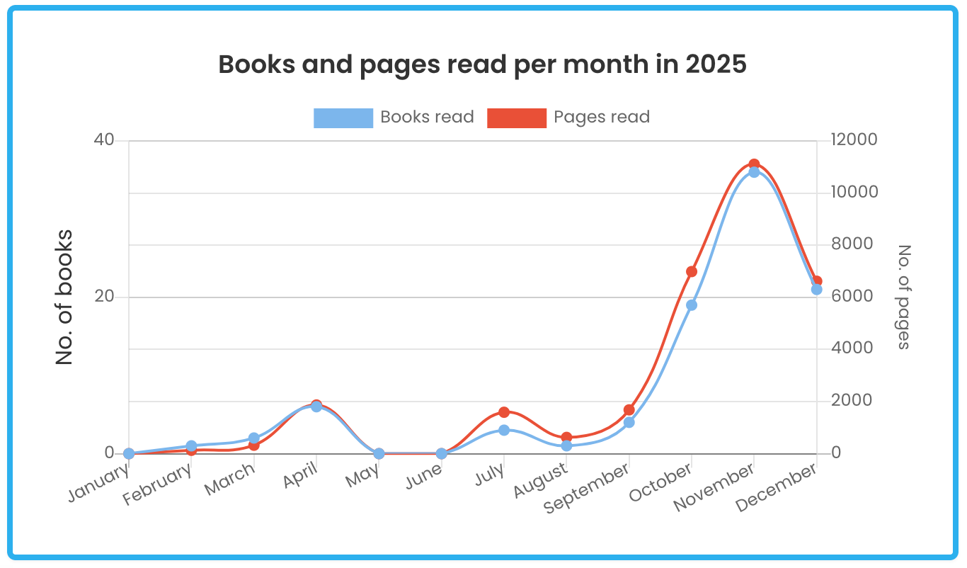 After reading the Empyrean series (aka all the Fourth Wing books), I could not get enough. See the chart below. In September, I kinda took off and read thousands and thousands of pages of romance. Most of it, with plus-size/fat main characters.